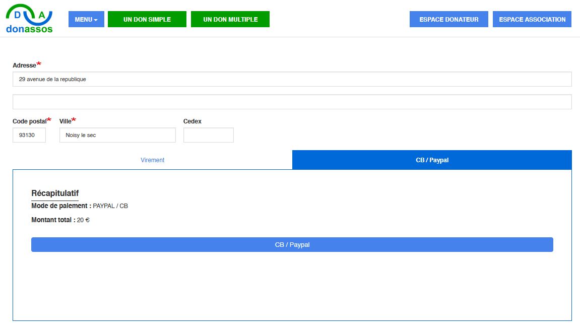Si, en tant que donateur, vous souhaitez effectuer un paiement via carte bancaire ou PayPal, il vous suffit de renseigner votre adresse postale et de cliquer sur le bouton bleu « CB/ PayPal ». Un formulaire apparaît, dès lors, affichant le récapitulatif de votre don (mode de paiement et montant total).
