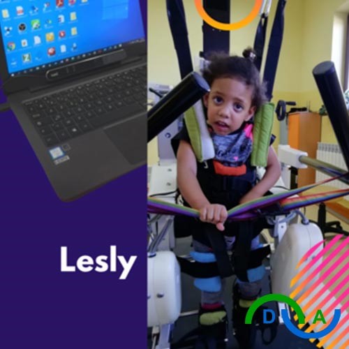 Lesly est née prématurément le 31/10/2014 à 32 semaines, avec sa sœur jumelle, à cause du STT (syndrome transfuseur transfusé). Elles ont été toutes deux hospitalisées au service de néonatalogie de Necker pendant 4 semaines. Suite à un électroencéphalogramme, les médecins ont découvert chez Lesly des "taches blanches". Après un contrôle à l'IRM, cela s'est avéré être des calcifications des noyaux gris centraux (participent au contrôle de la motricité involontaire, au contrôle du tonus musculaire et à l'harmonisation de l'activité motrice volontaire). Ce jour-là, sa vie a radicalement changé. Lesly était déclarée polyhandicapée neuromoteur. Elle a une prise en charge depuis ses 6 mois (CAMSP puis SESSAD).