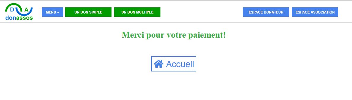 Votre paiement par virement a été bien pris en compte par l’équipe de DONASSOS. Retour à l’accueil si vous le souhaitez.