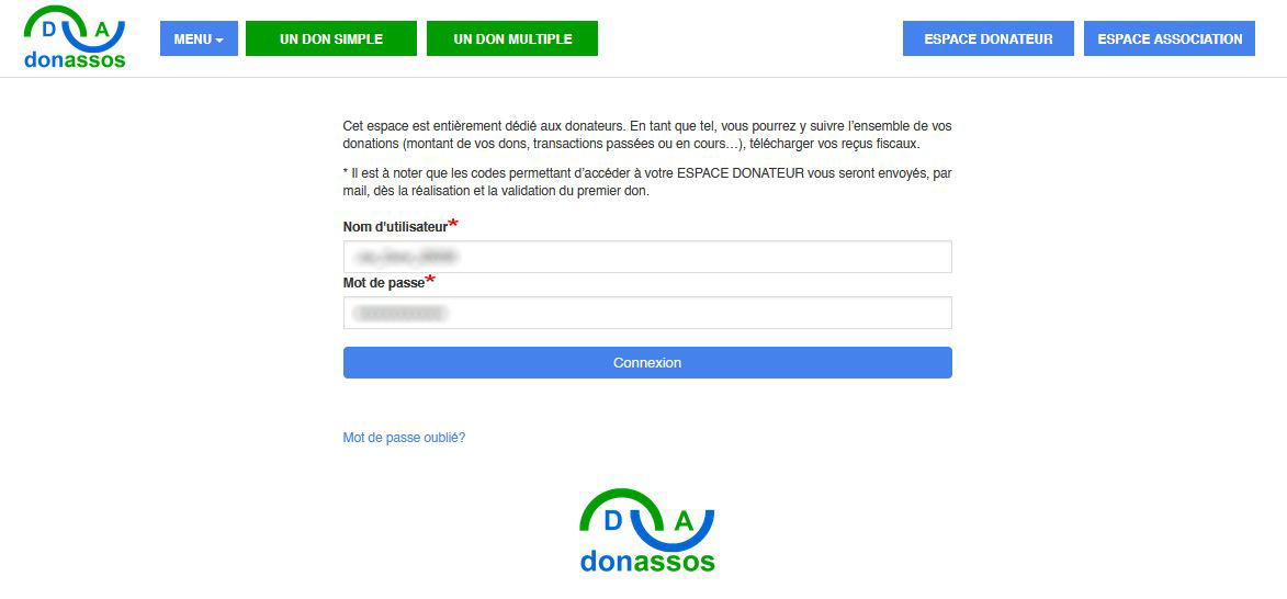 Rendez-vous sur la page d’accueil de DONASSOS, pour accéder à votre « ESPACE DONATEUR » et cliquez sur le bouton bleu « ESPACE DONATEUR » sur la droite de votre écran ou via le lien : https://donassos.fr/association/connexion. Puis, connectez-vous à l’aide de vos identifiants, envoyés par mail, par l’équipe de DONASSOS, suite à la réalisation et la validation de votre premier don.