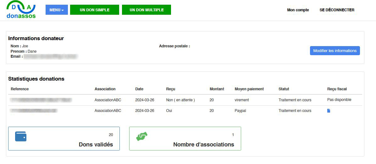 En plus des informations liées au donateur, le détail des dons effectués (Statistiques donations) ainsi que les reçus fiscaux sont disponibles dans la rubrique « Mon compte » dans le « Profil Donateur ». Il est, par ailleurs, possible de télécharger les reçus fiscaux.