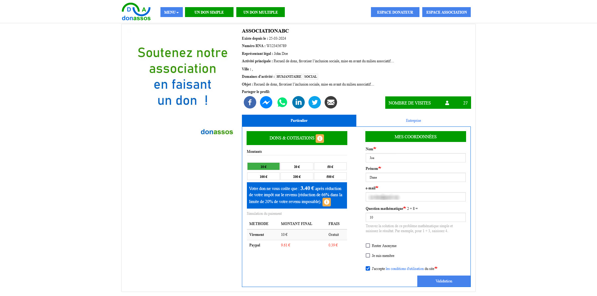 La page détaillée de l’association s’affiche comportant, entre autres, une partie « DONS ET COTISATIONS » et une partie « MES COORDONNÉES ». Deux options s’offrent à vous : faire un don soit en tant que particulier soit en tant qu’entreprise.