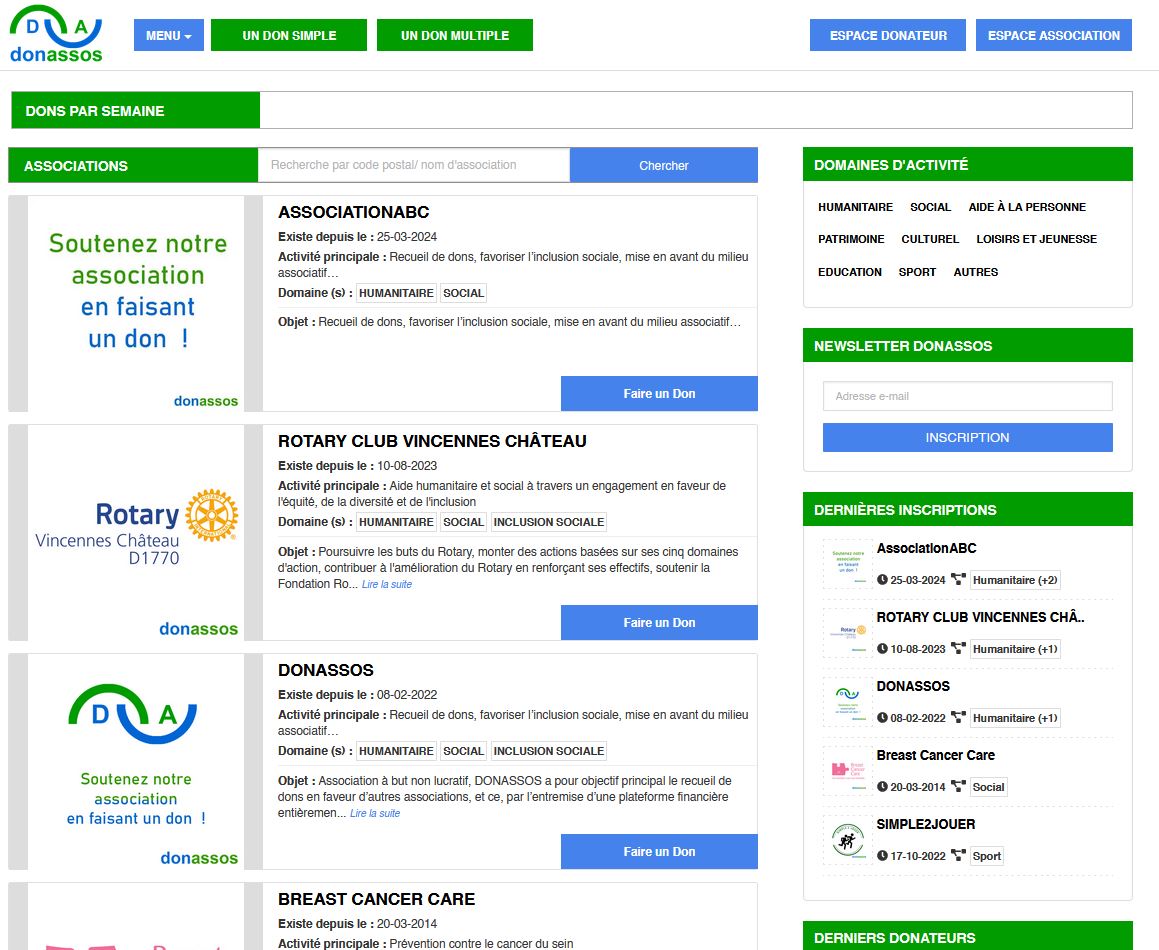 Pour effectuer un don en faveur de l’une des associations répertoriées sur le site de DONASSOS, cliquer sur le bouton vert « UN DON SIMPLE » en haut, à gauche. Une liste apparaît. Puis, après avoir choisi une association, cliquer sur le bouton bleu « Faire un don », situé en bas du profil de l’association.