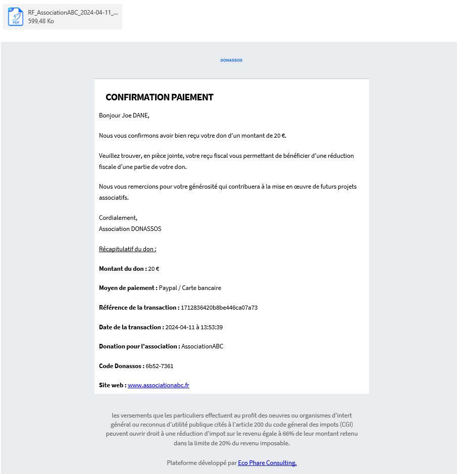 Vous recevrez, par la suite, un mail de confirmation de paiement avec, en pièce jointe, un reçu fiscal pour une éventuelle déduction fiscale. Ce mail contient, également, un récapitulatif des informations liées à votre don :