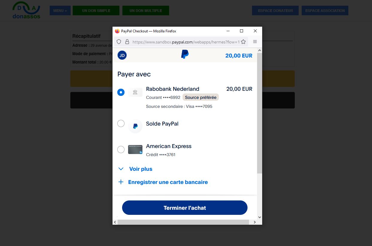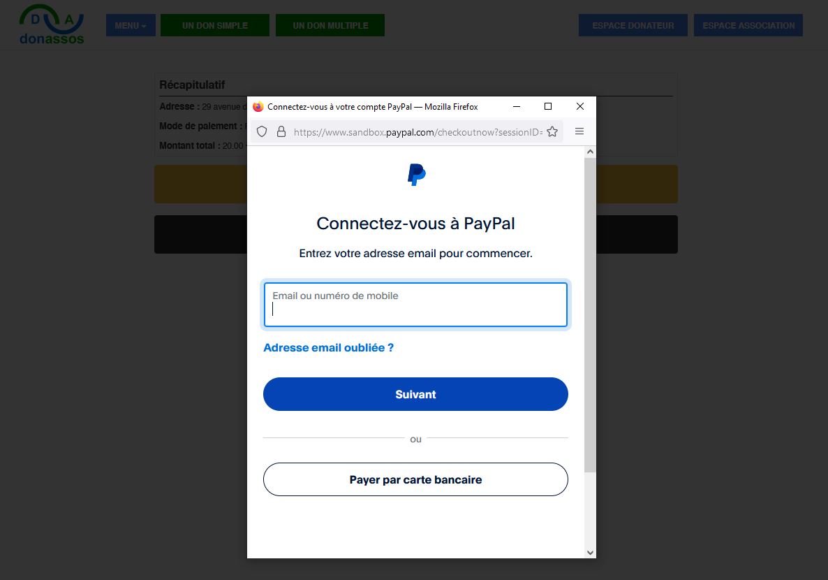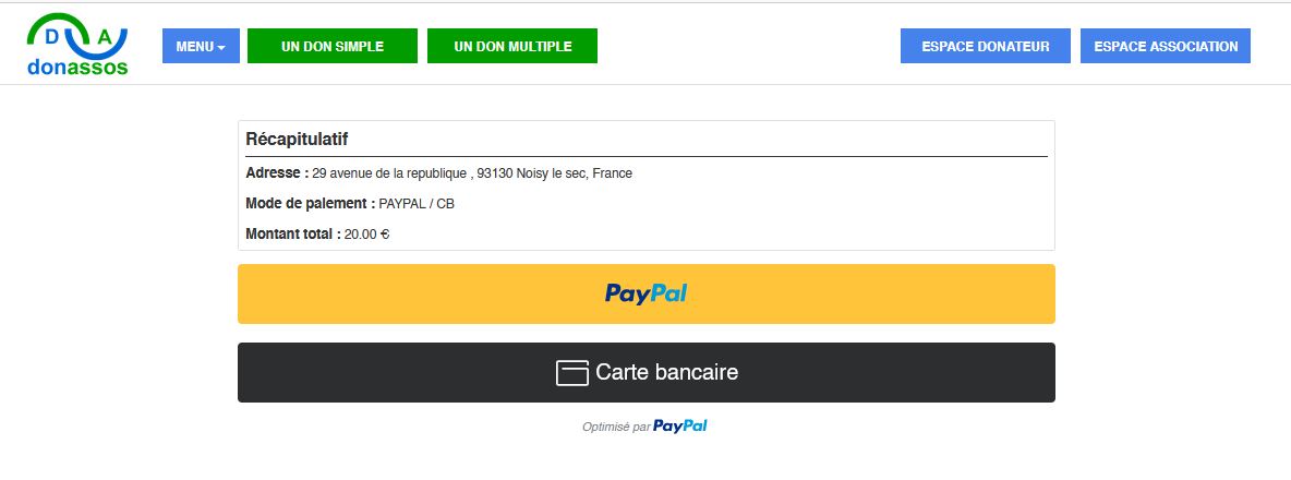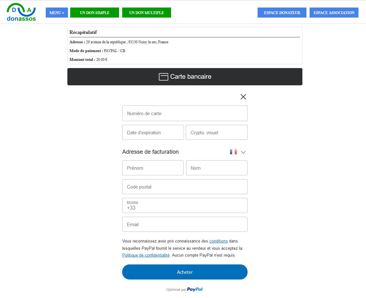 Si, en tant que donateur, vous souhaitez effectuer un paiement via carte bancaire ou PayPal, il vous suffit de renseigner votre adresse postale et de cliquer sur le bouton bleu « CB/ PayPal ». Un formulaire apparaît, dès lors, affichant le récapitulatif de votre don (mode de paiement et montant total).