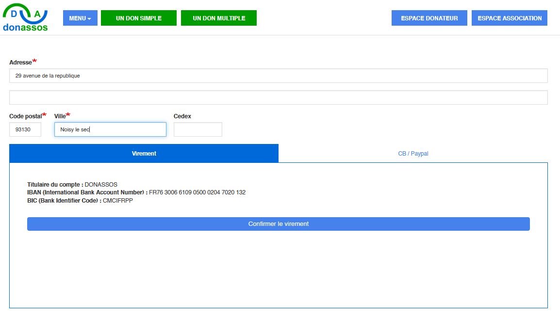 Pour pouvoir effectuer un paiement par virement, il faut, tout d’abord, saisir son adresse postale puis en utilisant les coordonnées bancaires de DONASSOS, réaliser un virement. Après avoir vérifié une dernière fois, l’enregistrement du don se fera en cliquant sur le bouton bleu « Confirmer le virement ».